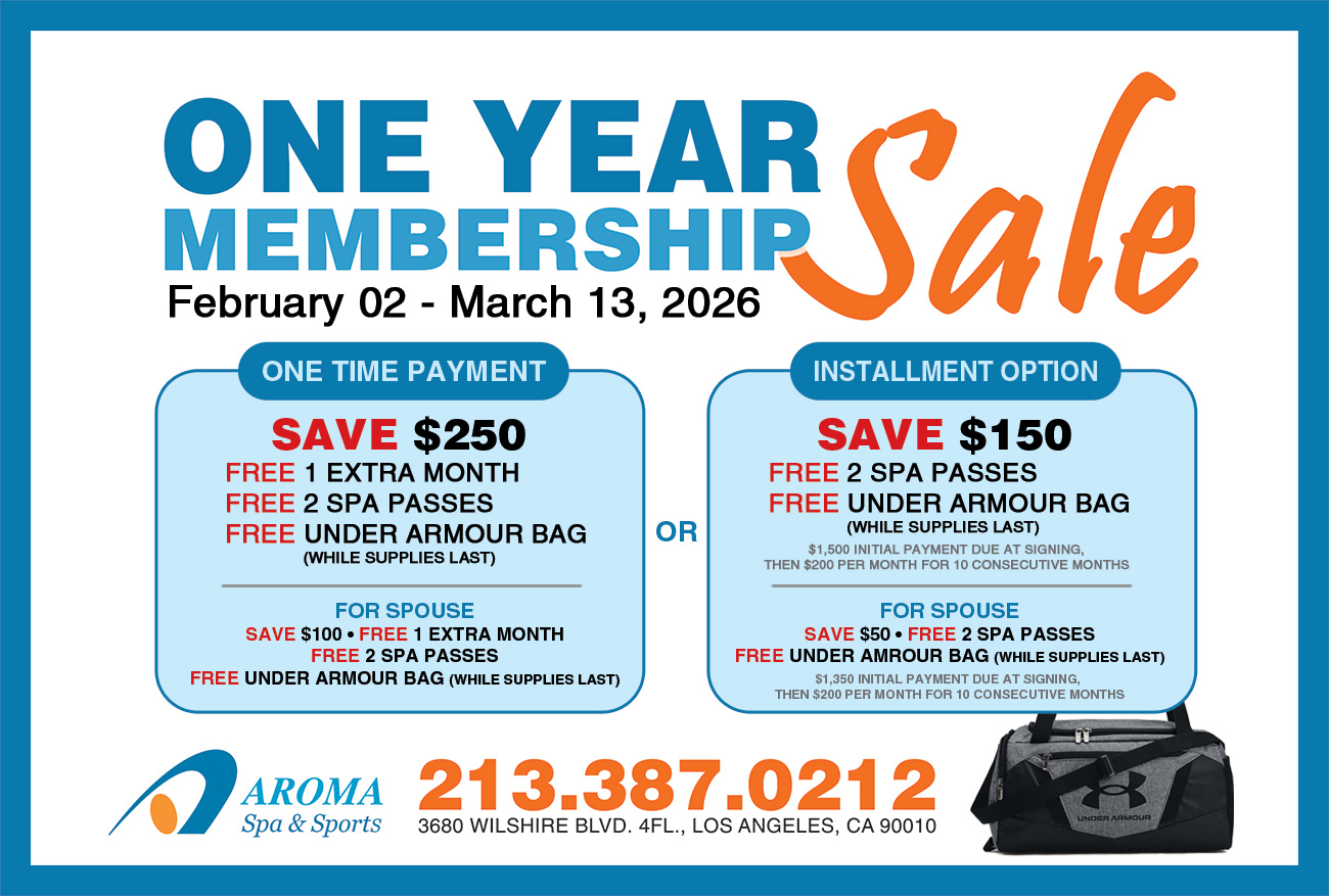 Los Angeles’ most sophisticated health center, Aroma Spa & Sports offers personalized massage and spa treatments in an elegant, welcoming setting. Bask in a selection of sauna styles and temperature options: Steam, Dry, Clay, Jade, Korean Medicinal Healing Stone, Thermo-infrared ray; plus hot, temperate and cold pools and tubs.